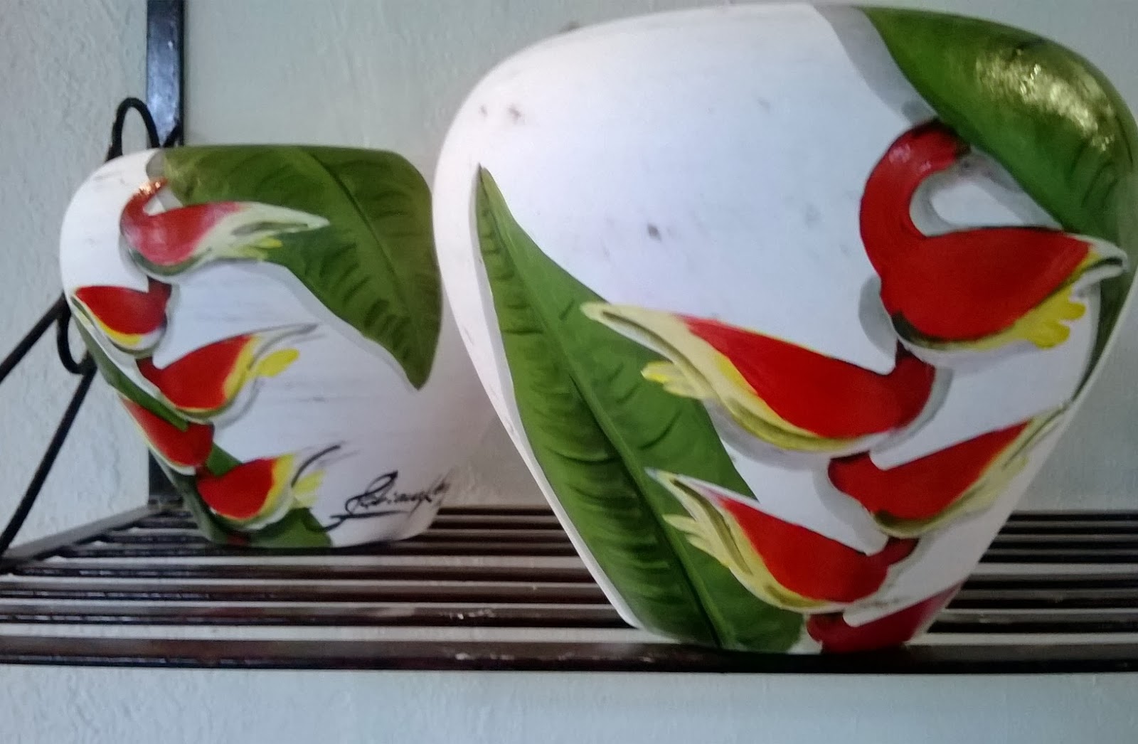 Linha de cerâmicas pintadas, cachepôs, jarras, vasos, pratos de parede e filtros.